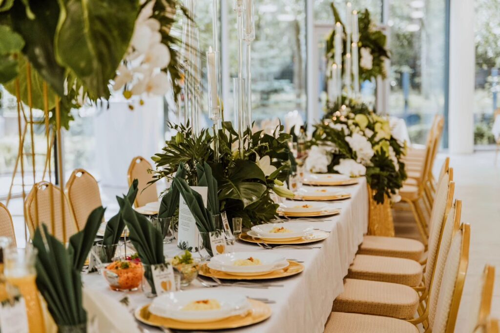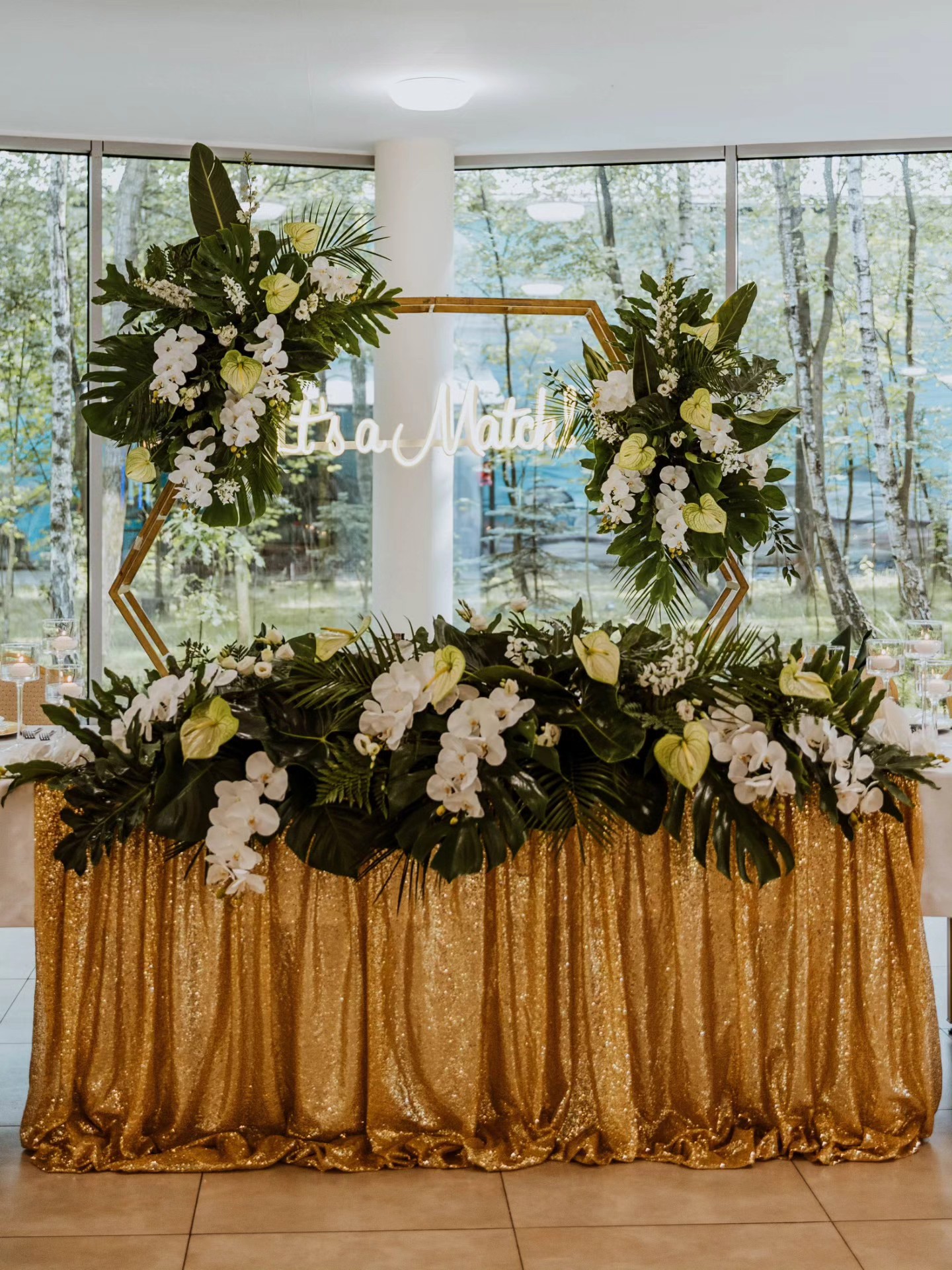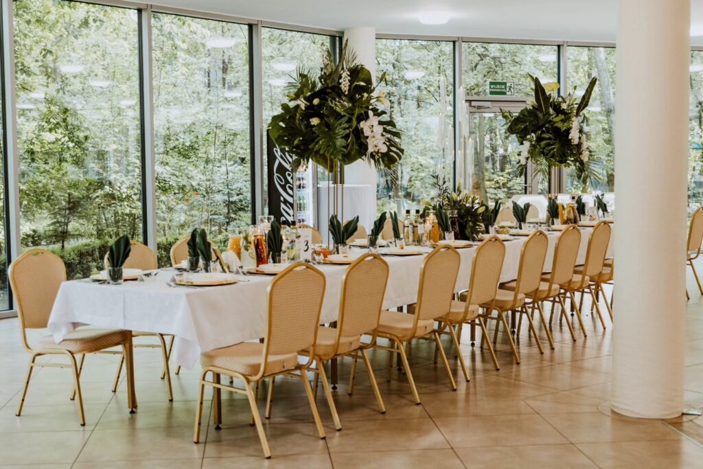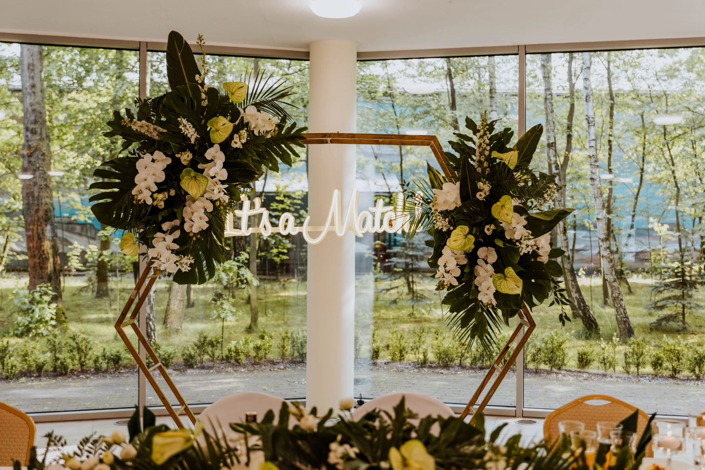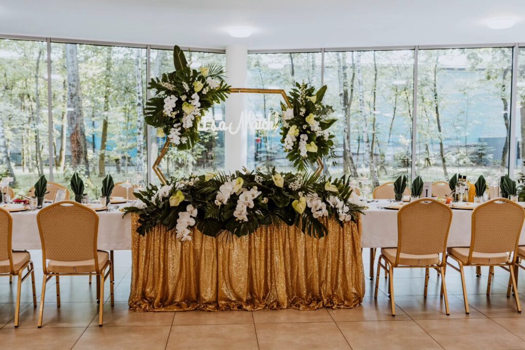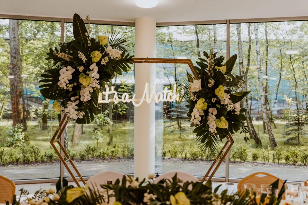 Prezentujemy unikalną dekorację z naszej oferty, która łączy kunszt florystyczny z elegancją i tropikalnym klimatem tworząc niezapomniane tło dla wyjątkowych chwil.